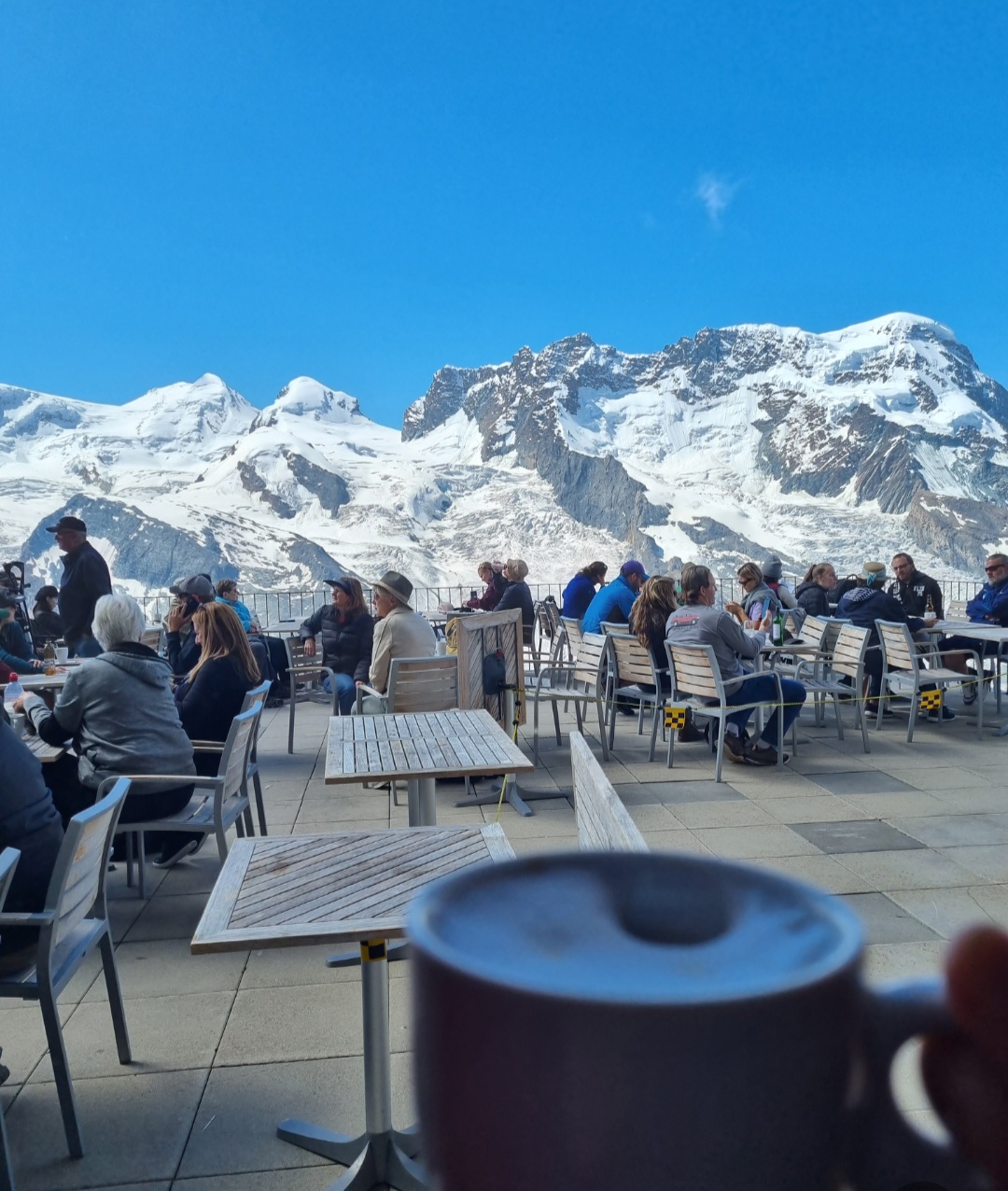 고르너그라트 전망대에서 눈 덮인 설산을 바라보며 따뜻한 커피 한잔의 여유를 느껴본다