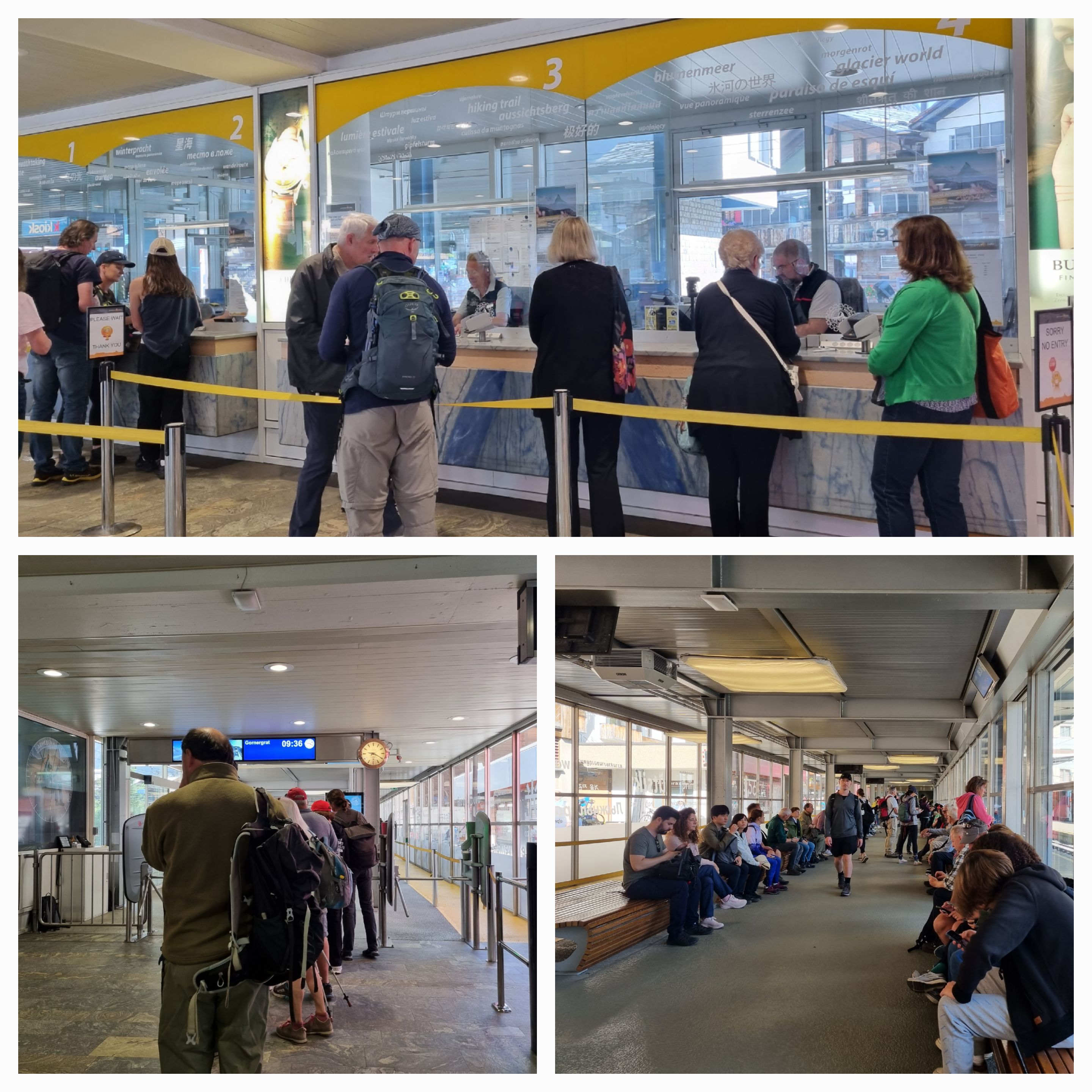 고르너그라트 전망대 오르는 산악열차 티켓을 구매하고 줄 서서 입장하여 열차가 오기를 기다리고 있는 관광객들 모습