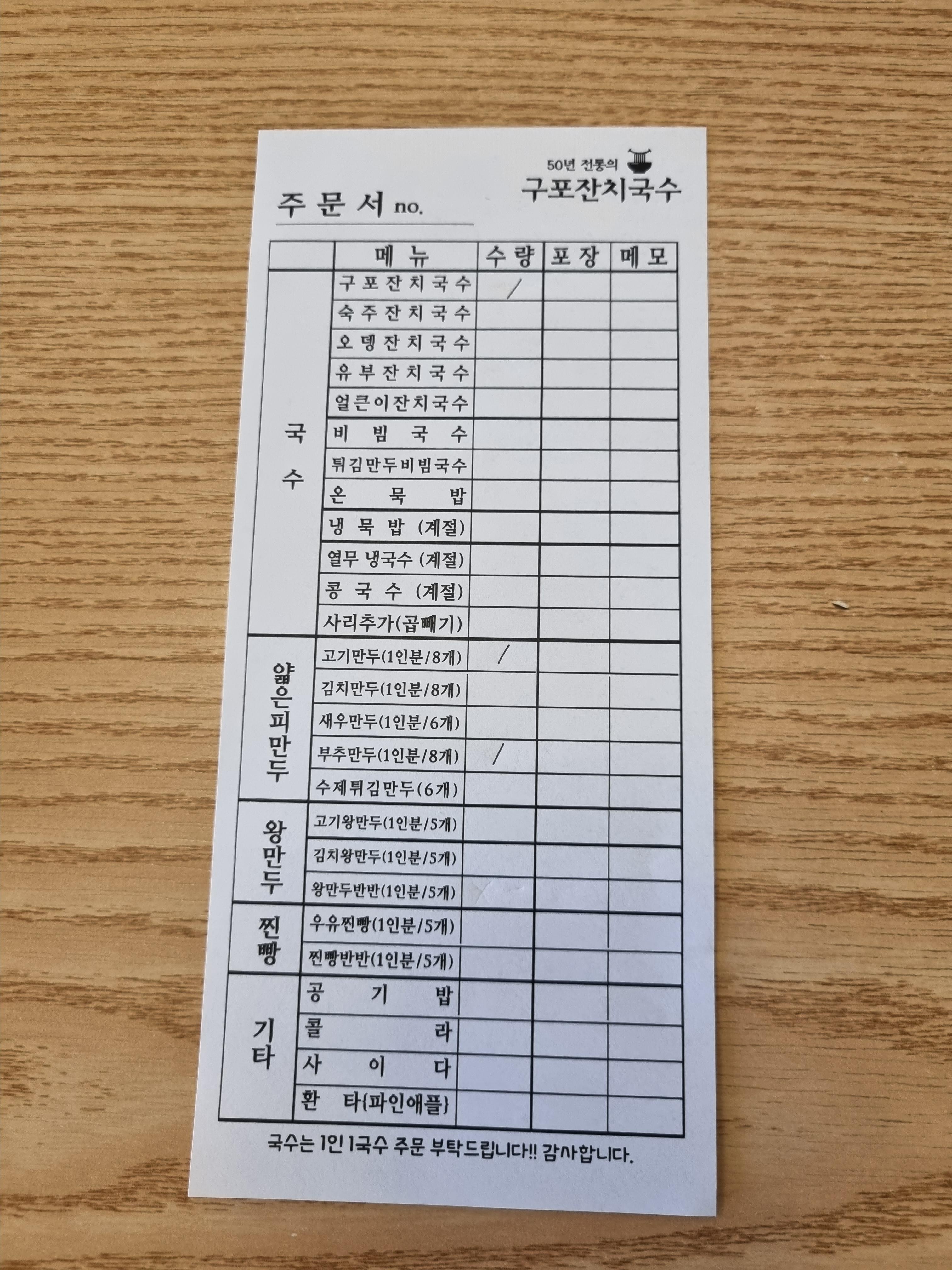 식당 테이블에 비치된 주문서에 직접 표시하고