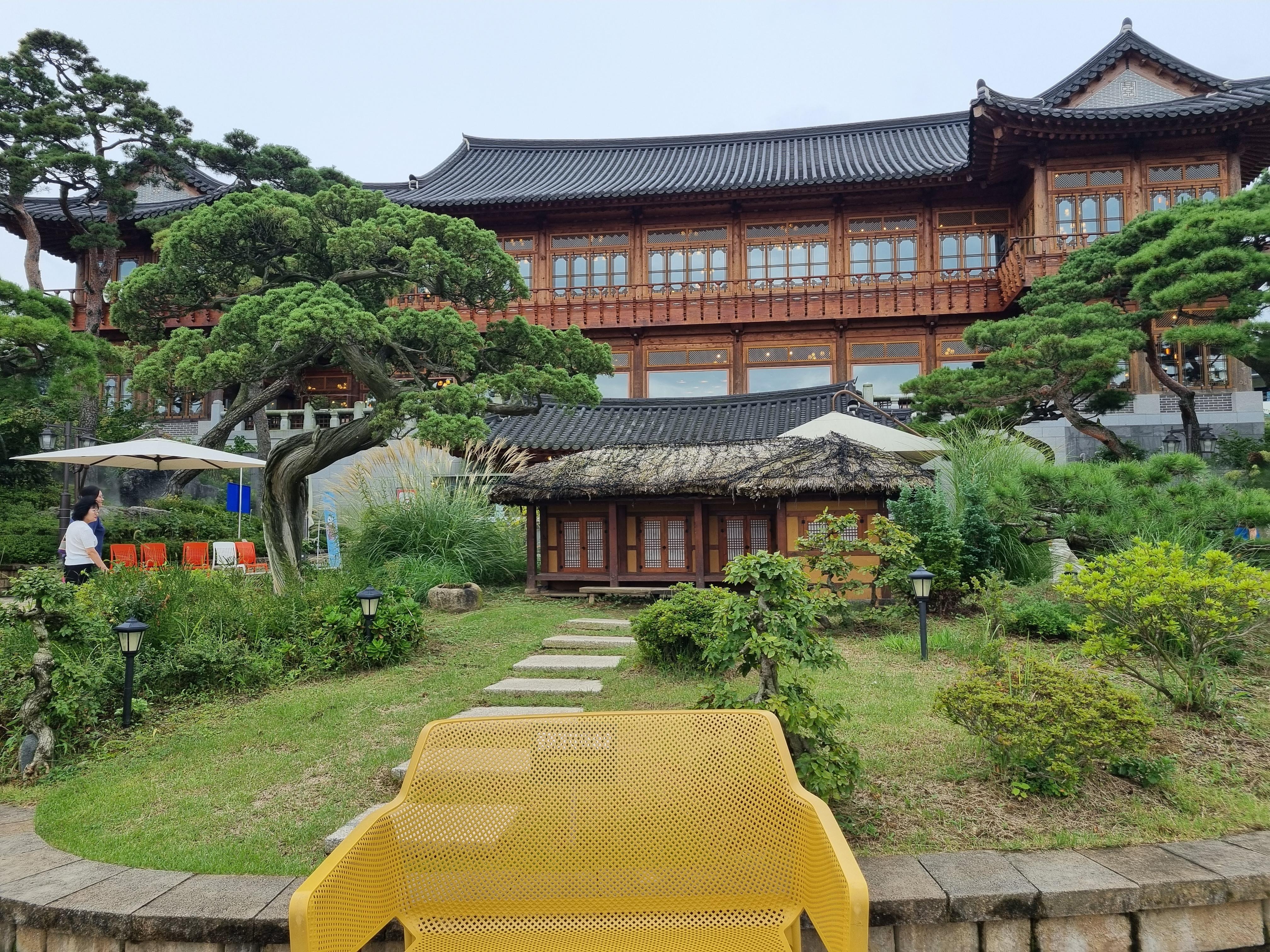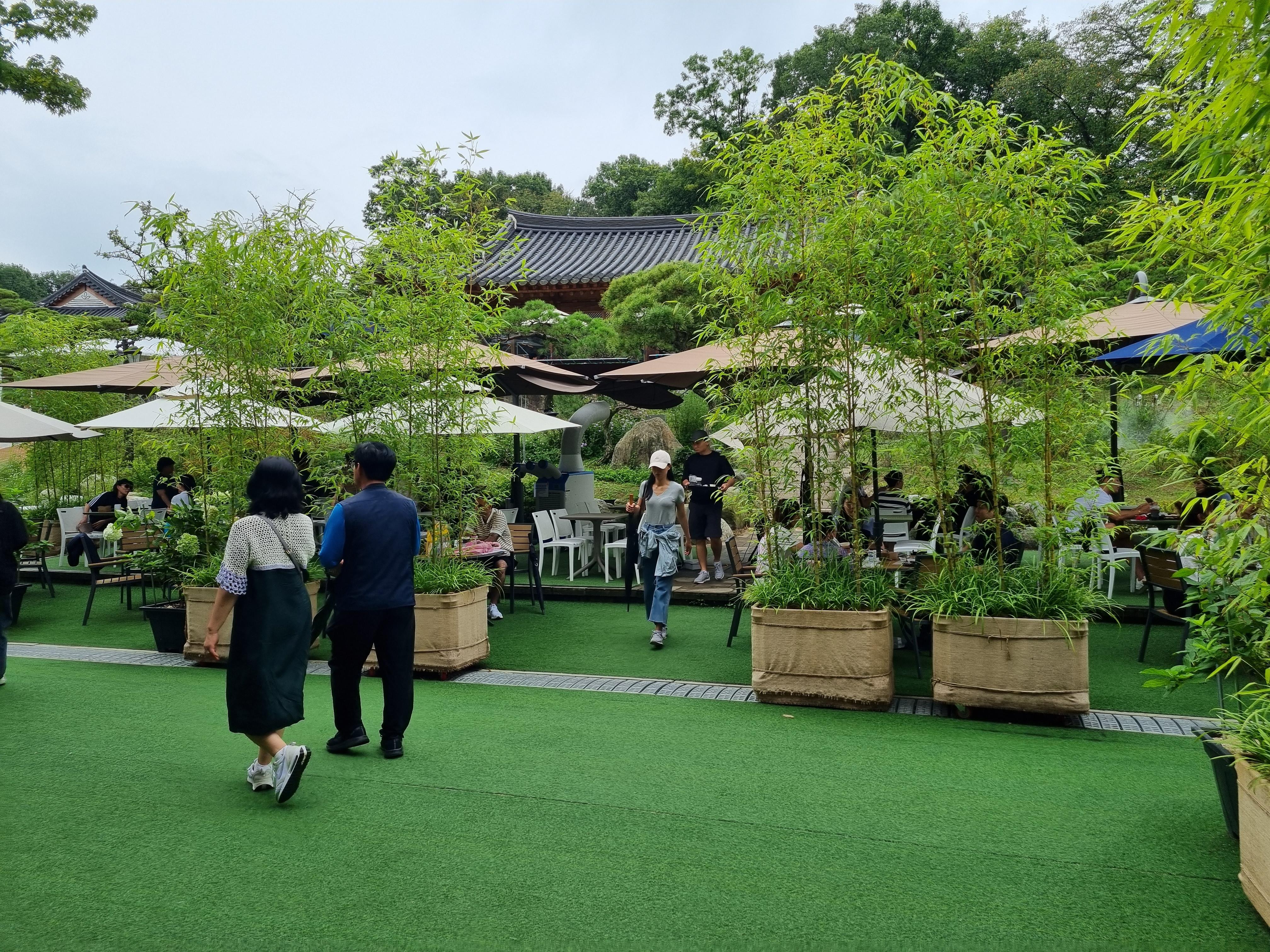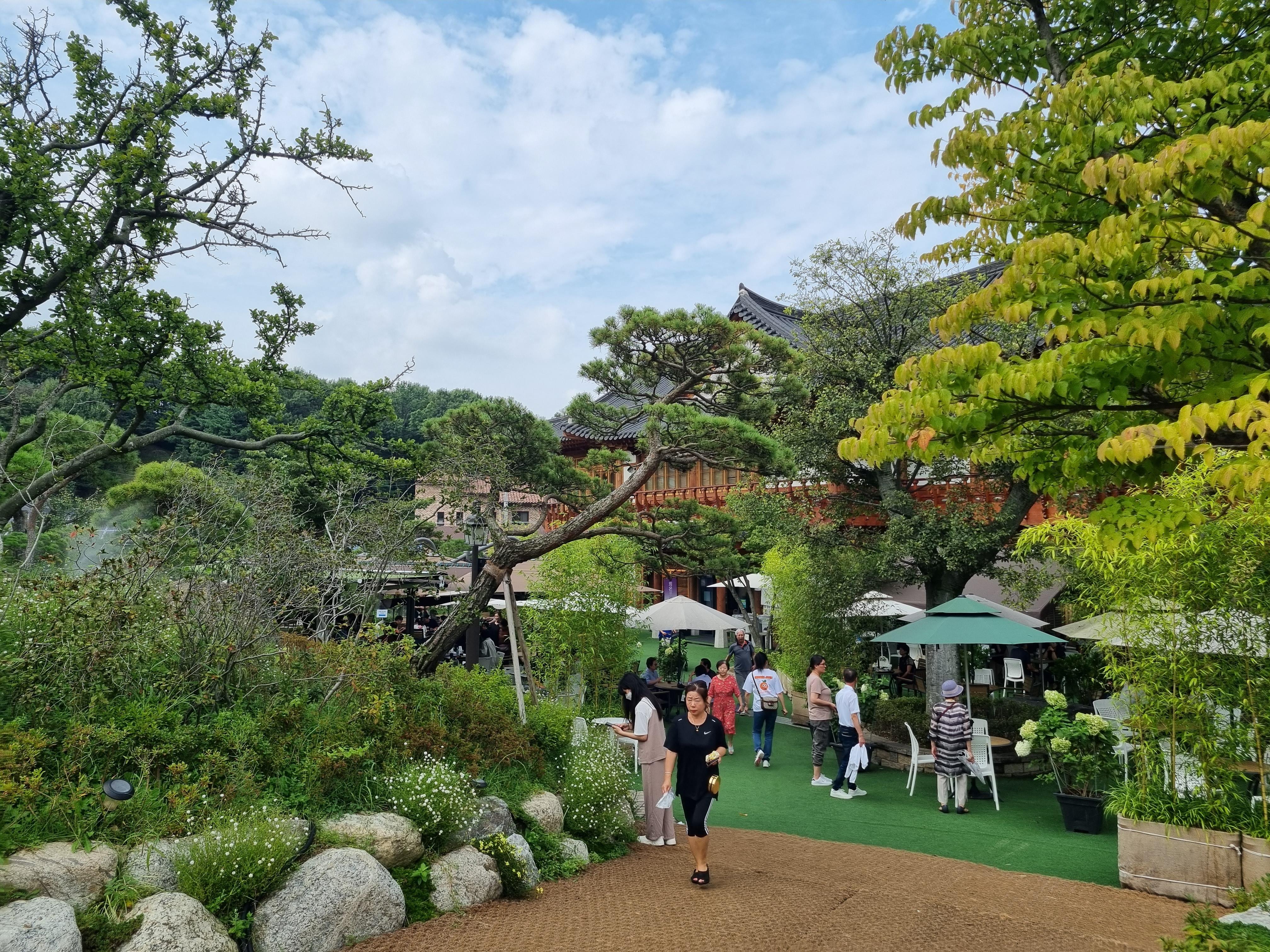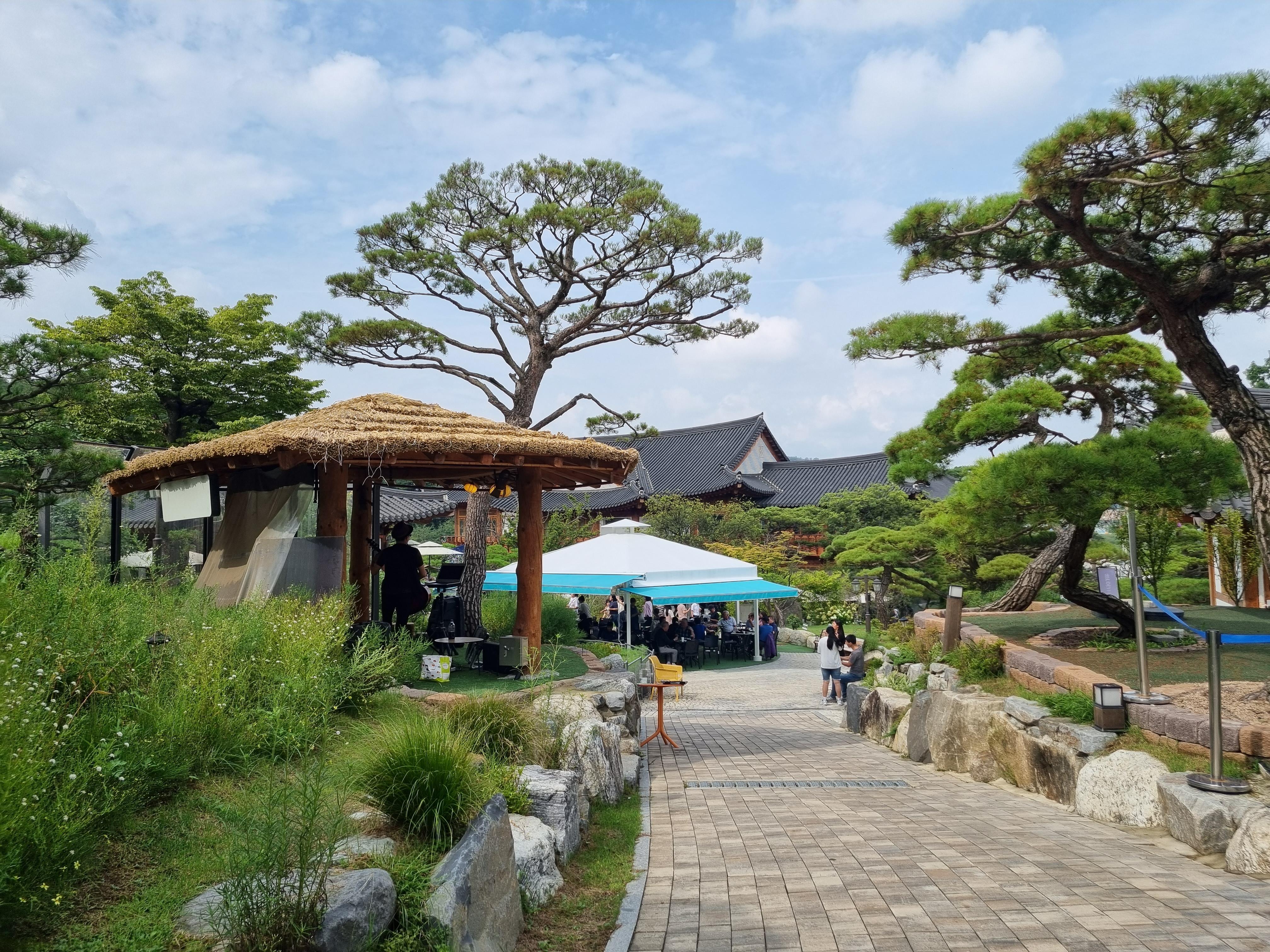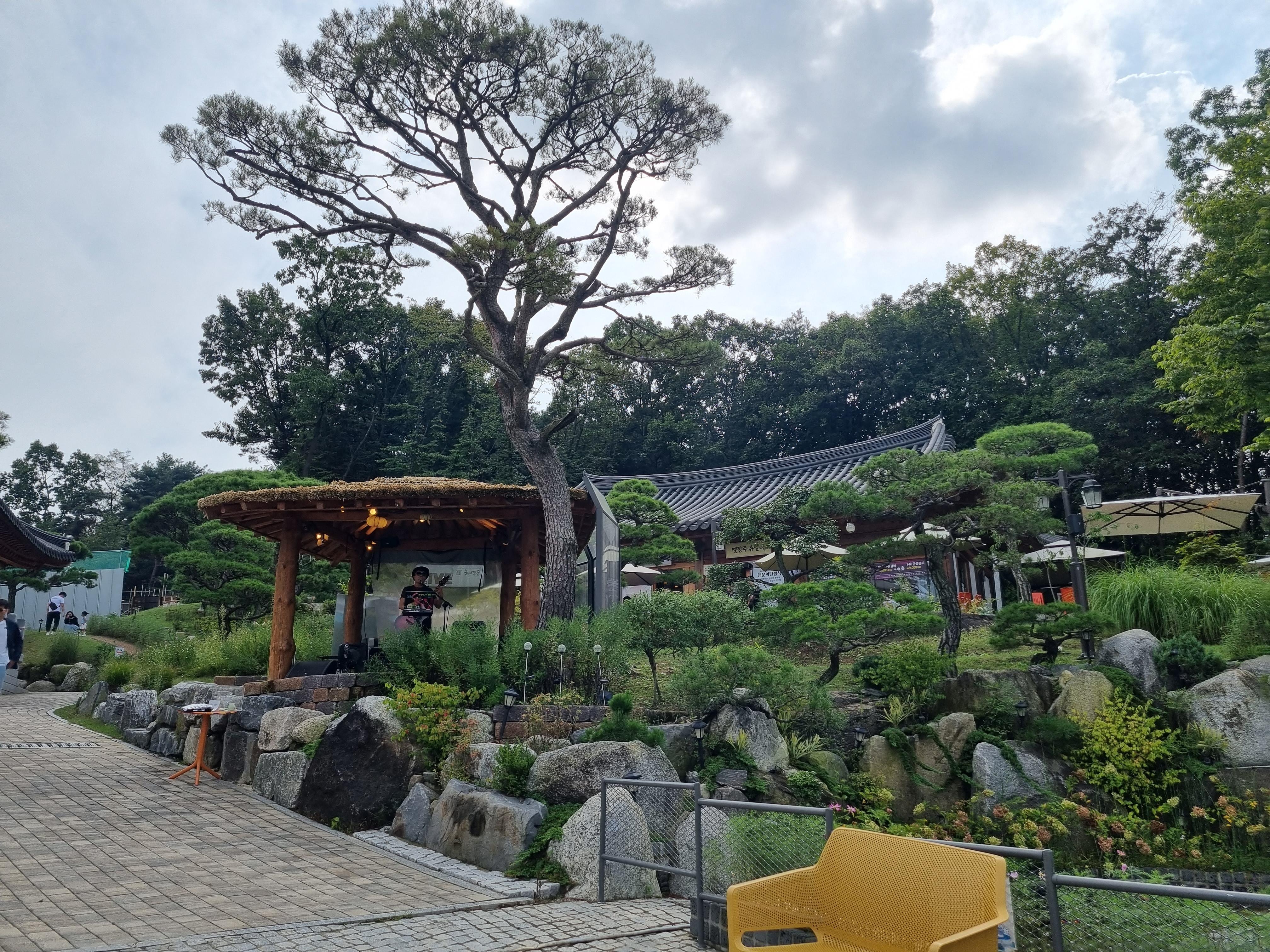 건물 뒷편에는 한옥 4채, 분수광장, 라이브 공연하는 초가집, 자작나무 쉼터, 산책로가 있고