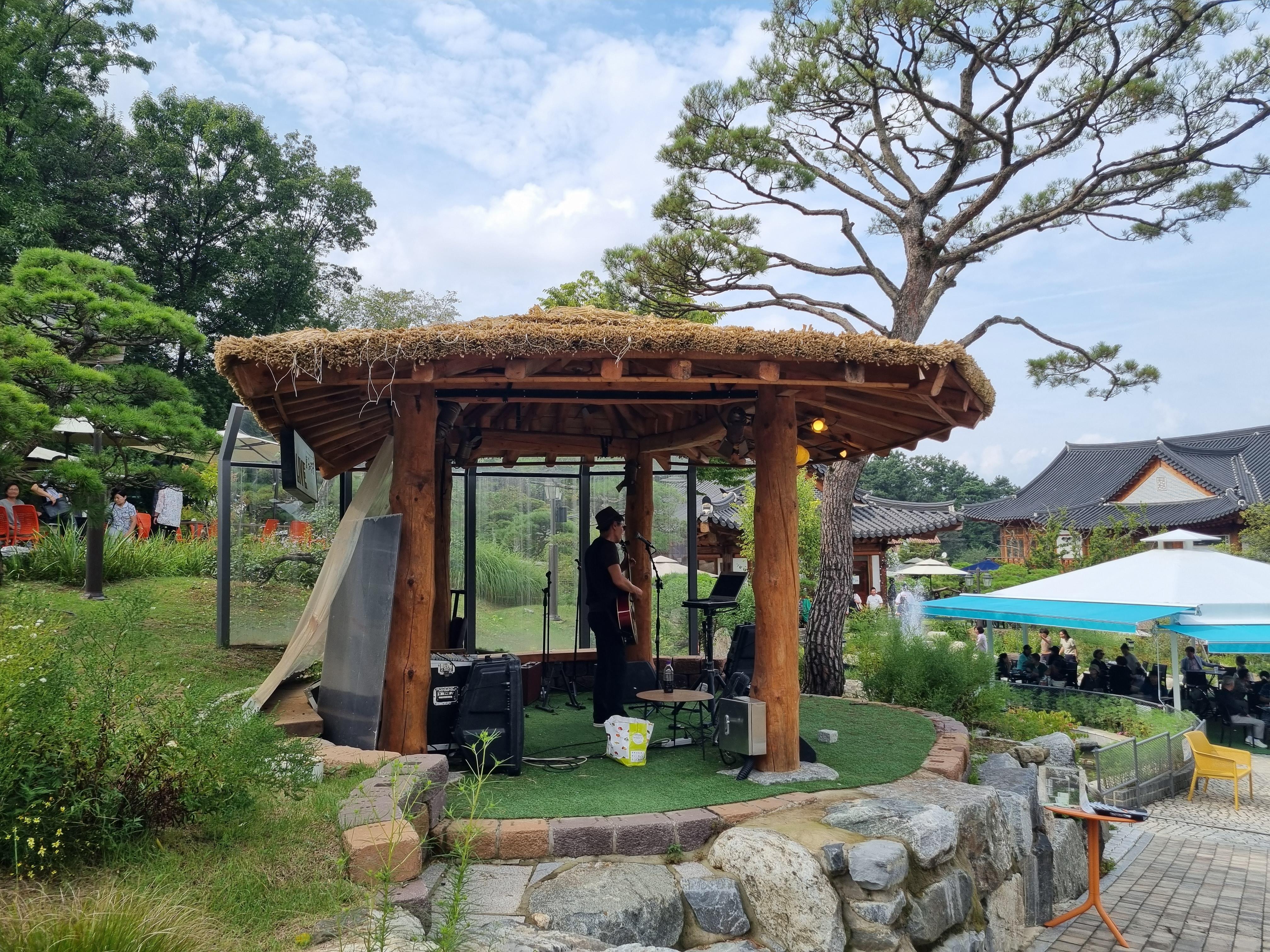 라이브 공연하는 초가집에서 바라본 혜경궁베이커리 본관건물 모습
